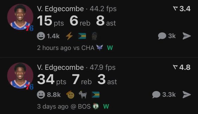 76人新科探花VJ-埃奇库姆首发出战39分半钟,15投6中,三分3中1,罚球2中2,得到15分6板8助3断1帽2失误,正负值+9全队第三。跟生涯首秀34+7+3相比,埃奇库姆的表现有所回落。但是再看看同届新秀,他已经足够出色。