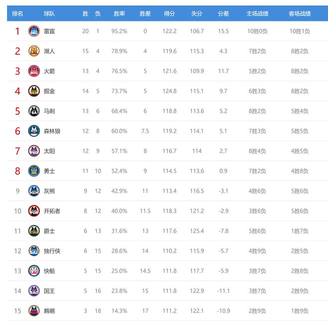 NBA西部最新积分榜:雷霆第1,湖人第2,火箭第3,马刺第5